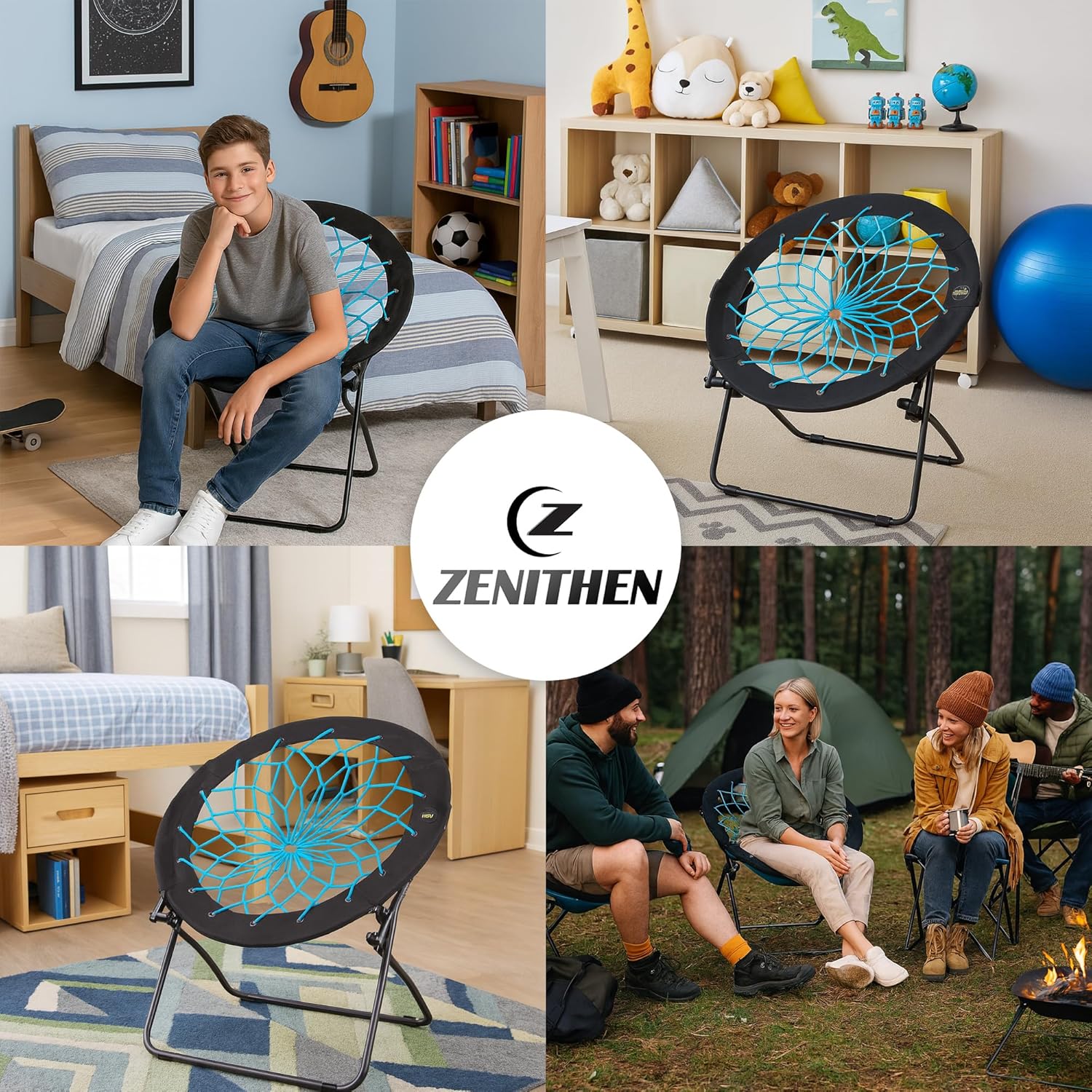 Bring flexibility and comfort anywhere with the Zenithen 29" Bunjo Bungee Chair in Teal. Designed for versatility, this folding circle chair is ideal for dorm rooms, teen bedrooms, game lounges, or even outdoor gatherings. Its breathable bungee cord webbing molds to your body for a soft yet supportive feel, making it perfect for lounging, gaming, or hanging out with friends. Built on a durable steel frame, it supports up to 225 lbs and folds down flat to just 2” in height. No tools or setup needed - just unfold and relax. When opened, this chair measures 29” x 20” x 32” (LxWxH) with a 18” seat height. Whether you need extra seating for a party, a comfy chair for your dorm, or a pop of color in your room, this portable Bunjo Chair is your go-to pick!