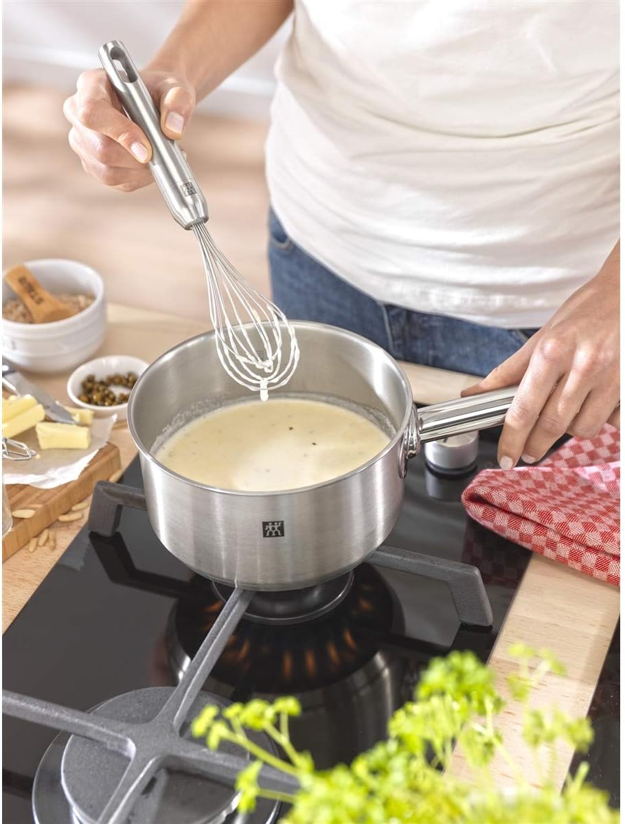 TWIN Professional whisk, small, 230 mm The TWIN Prof kitchen aids integrate a reliable functionality into their sleek and purist design. Whether preparing, cooking, or serving - even professionals are impressed by this kitchen aid. These reliable kitchen aids are able to handle even the most demanding tasks in the kitchen. Features: Optimum functionality - each kitchen aid meets the application-specific requirements. The design of the TWIN Prof series is the result of close cooperation between Zwilling and the Milanese architect and designer, Matteo Thun. Both the handles and the functional parts are made of high-quality stainless steel. These kitchen aids are stainless, dimensionally stable, and easy to maintain. Most products in this series are seamlessly processed and therefore extremely easy to clean. The functional parts are firmly and water-tightly anchored in the rounded handle. This ensures high reliability, long life, and perfect hygiene. These kitchen aids also have a non-porous, smooth, and carefully machined surface. The edges are rounded, and all surfaces have a velvety matte finish. Most products in this series have a flat handle. Only the utensils that are used with much force or over a longer period (e.g. peeler and whisk) have a rounded handle. TWIN Professional whisk, small, 230 mm Suitable for tall, narrow vessels as well as for large mixing bowls. The thick wires can handle even the thickest more effectively. Creams and sauces can be readily beaten and mixed. Key features: Stainless steel Slim and stable stainless-steel handle for safe and easy handling Dishwasher-safe Hanging loop